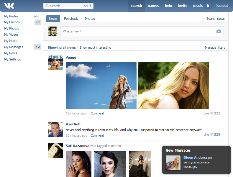 VKontakte是俄罗斯在线社交网络服务网站,拥有86种语言,用户主要来自斯拉夫语体系国家,其中在俄罗斯、乌克兰、白俄罗斯、哈萨克斯坦、美国等国较为活跃。 与Facebook类似,VKontakte允许用户公开或私下留言、创建社区、公共页面和活动,也可以分享和标记图像、音乐和视频、基于浏览器的游戏等功能。